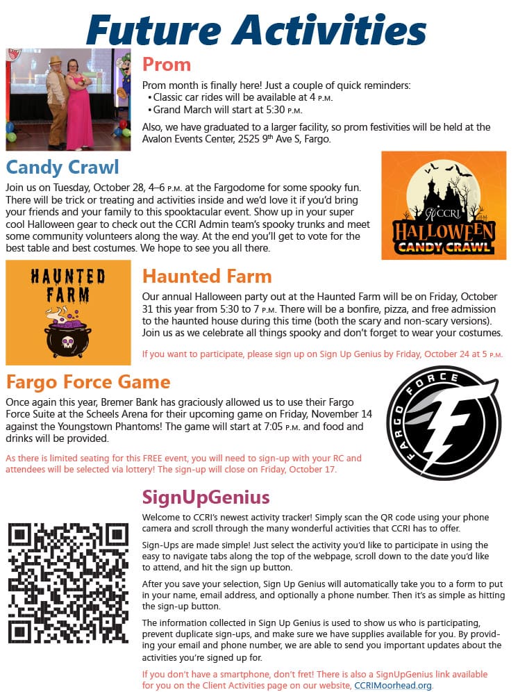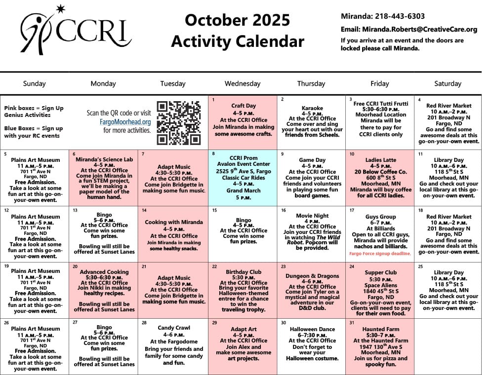 To all staff and family members: we need volunteers to help participate in the activities. If you are interested in volunteering, email Miranda at Miranda.Roberts@CreativeCare.org or call at (218) 443-6303.